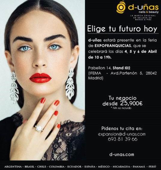 08 marzo 2019 d-uñas en Feria de Franquicias Madrid Tiempo de lectura 3 min. Inicio Notas de prensa d-uñas en Feria de Franquicias Madrid ES ES ES d-uñas participara en EXPOFRANQUICIA 2019, en Madrid, STAND I02, Pabellón 14, los dias 4,5 6 6 de Abril. Enviar