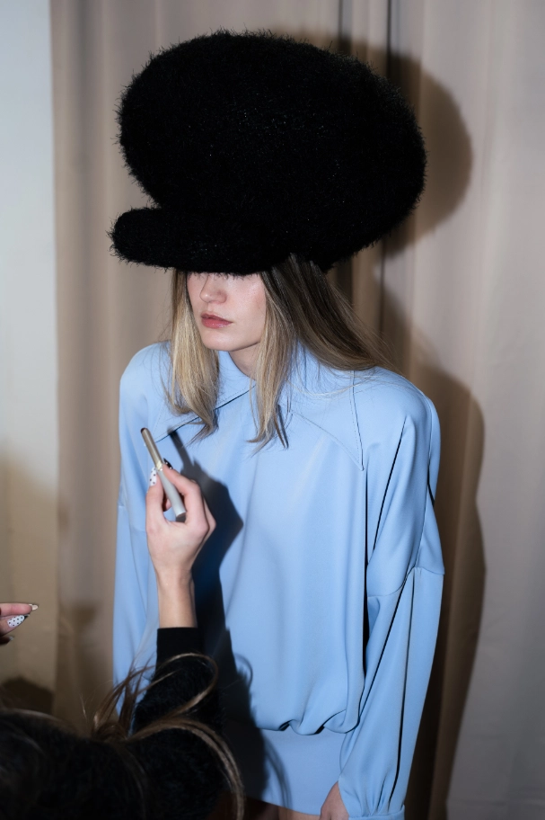 Las prendas se construyen desde el contraste y la convivencia de opuestos, como rigidez y fluidez, peso y ligereza, luz y sombra. Cada silueta funciona como un espacio donde las tensiones no se anulan, sino que dialogan.