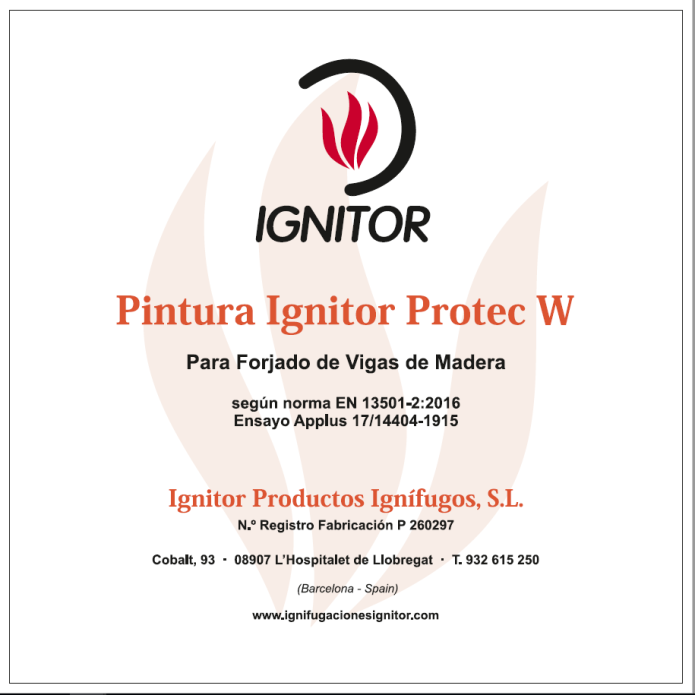- Ensayo de APPLUS nº 17/14404-1915, pintura Protec w para forjados de vigas de madera REI-120. La última capa se puede aplicar del color deseado.