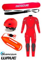 Mono húmedo de Rescate Wave con una alta visibilidad en rojo y múltiples puntos de pintura reflectante para una condiciones de baja luz, costuras selladas, neopreno ultraelástico de 5mm salvo en pantorrillas, axilas y hombros que es de 3mm para permitir un mejor nado. Protecciones plásticas en rodillas en powertex. Bolsillo en hombro escamoteable con ventana transparente para la colocación de luz química o estrobo.