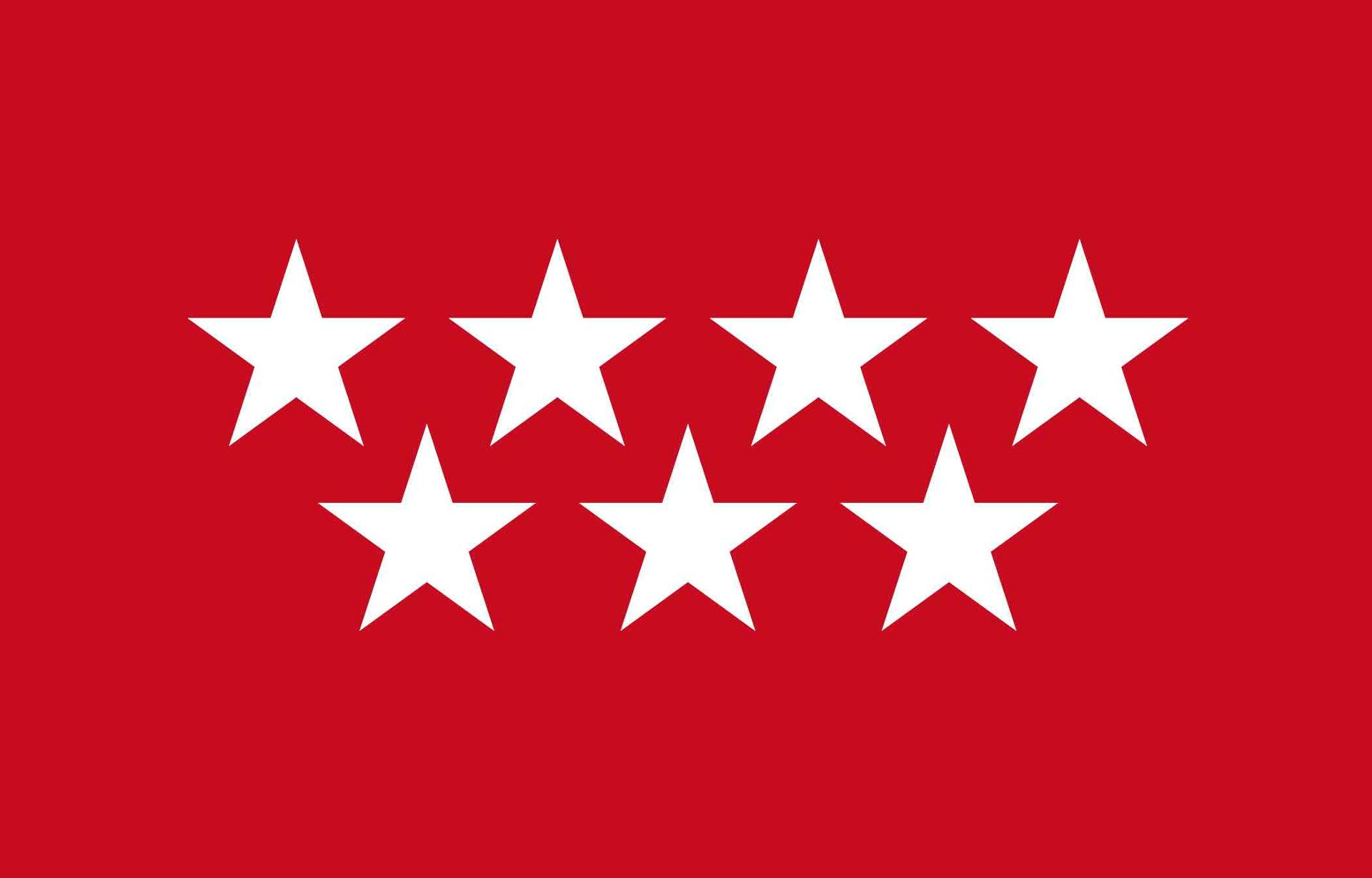 - La bandera de Madrid es de color rojo (gules) con siete estrellas plateadas de seis puntas.